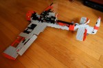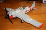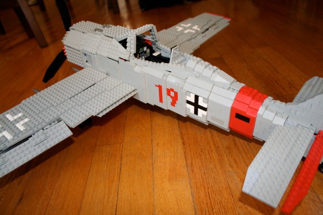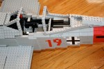 With a project this size, it took a great deal of work to get the shaping of the plane to work right. I used half stud offsets to get the fuselage correct, and spent a lot of time on the wings. Because the cockpit had a lot of activating levers, a lot of work went into the area around here. Adding the opening canopy did not help things. I added brick built markings, worked on the coloring, and spent some time adding guns and other details. The model was done.
