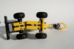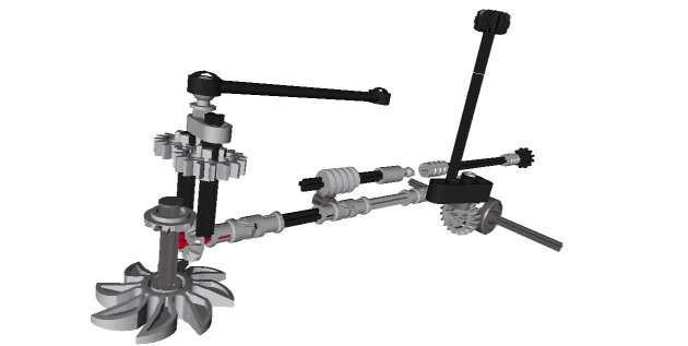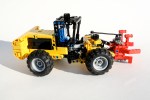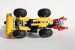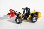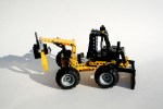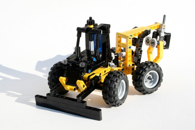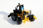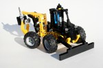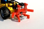 I connected the rear part of the skidder to the front part with the new small turntable. This allowed for simple gear connection with a 20z gear to the Hand-Of-God steering. This worked well, and kept the model simple. Just in front of the steering mechanism, I added another 24z gear for the plow. Taking a cue from set 8069, I set the worm gear vertically, and connected it to the exhaust stack; simple and pretty. I then filled in the space. A simple body was added, as was the plow, and wheels, though not in the cleanest of ways.