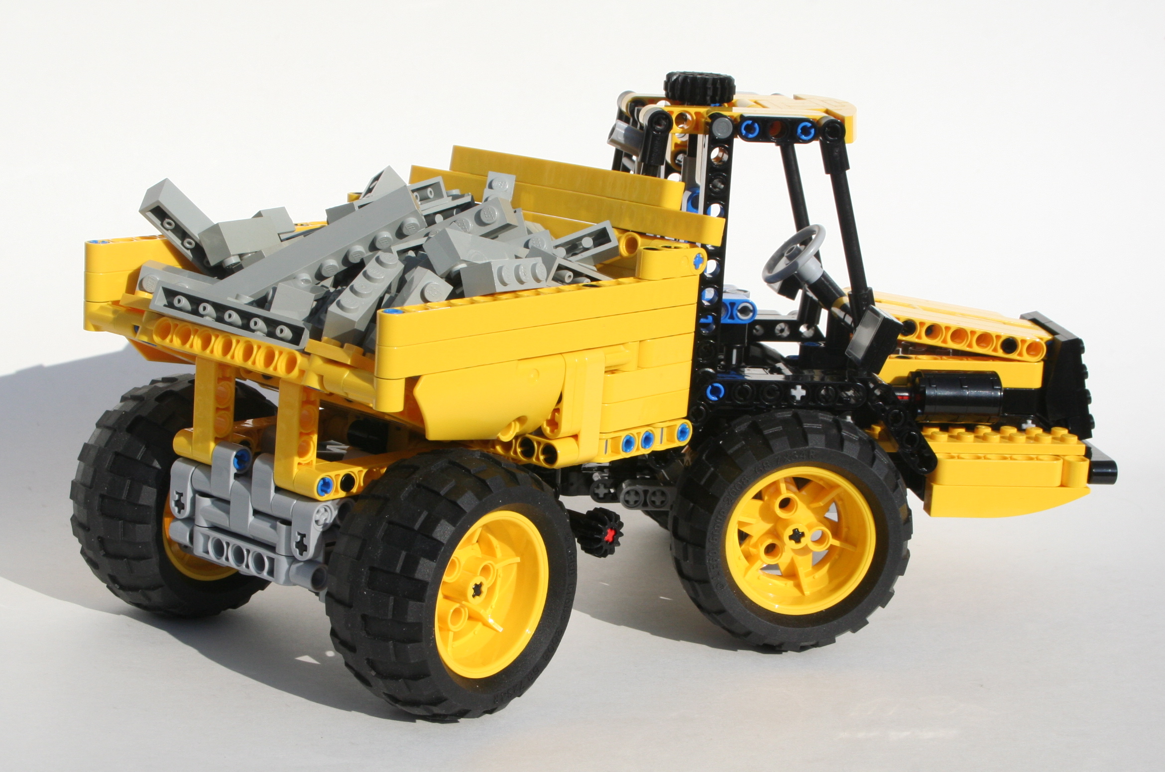 The rear was more challenging than I expected. First, I had to plant the mLA’s in such a way that they could be connected by a single axle that would not impede the driveline. Second, the mLA’s had to operate in such a way that the bucket could do the full range of motion; nearly 90 degrees. Third, the shape of the bucket did not work well in LEGO, as there were limited flat surfaces. Thankfully the sides were flat, and some of the bottom. The bottom was connect to the dump pivot, and the sides would hold the angled panels. Finally, it had to make sure the rear wheels could still move freely. While there are still some holes in the dump, it works well enough to transport a bunch of bricks.