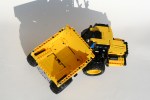 This MOC started when I was browsing the JCB UK website. I thought the 714 would be a fun little project that would have some nice features, and would utilize some of my collection that is not currently being used. I started working on the frame. The MOC would have a four wheel drive system, suspension, steering, and a dumping back. I designed two suspension/steering designs, and while the first one was awesome, it was not as stable as I would have preferred. So I reverted back to the design utilized on the real JCB. It was not as flashy, but it worked well. A turntable is planted behind the steering pivot, with the drive axle moving through the center of both. A liftarm was placed on the left to operate the steering function. The drive axle would connect to both axles through a 12/20 gear reduction which connected them to two differentials. The I3 motor was placed in front of the forward axle.