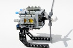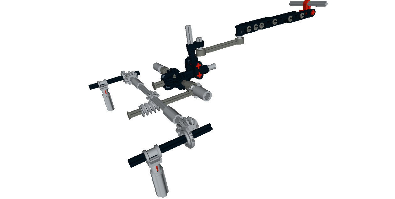 Working backwards, I attached the leading edges of the wings, and the worked on the landing gear. Being an air racer (even a biplane), it had to have retractable landing gear. I connected the two wide spaced legs with a simple axle and bevel joint, and added a worm gear to articulate the action. It is a simply solution, and it functions well.