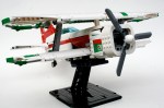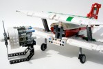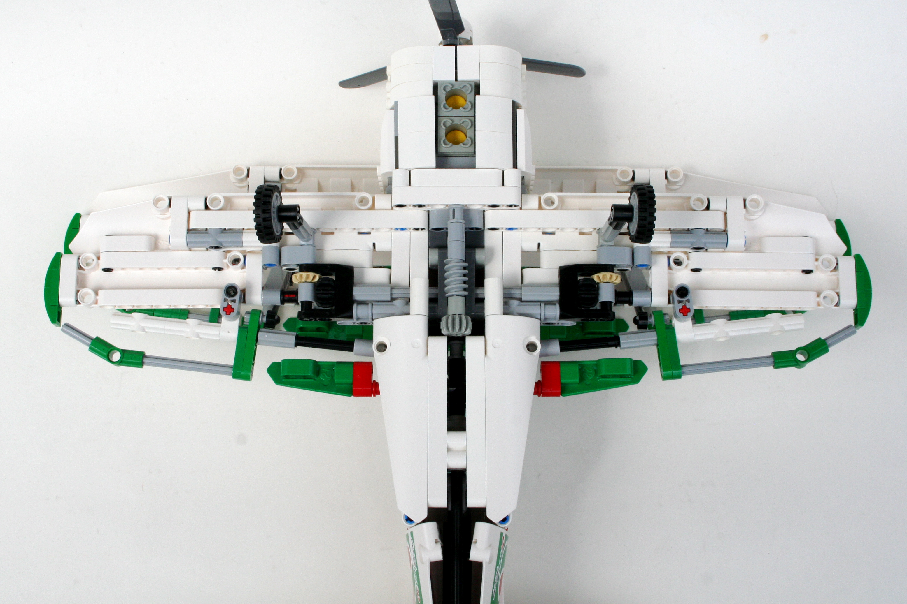 After the radial, the bodywork was the priority for the MOC. I have been slowly acquiring white and green parts over the last year. The airplane was designed as primarily white, with red and green accents. The red stripe worked well, as did the red tail, but I could not find a great way to incorporate the green. I added a little to the tips of the wings, and to the wing control surfaces. I used a couple more stickers that I had left over from set 60025, and the MOC was finished.