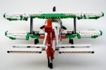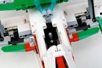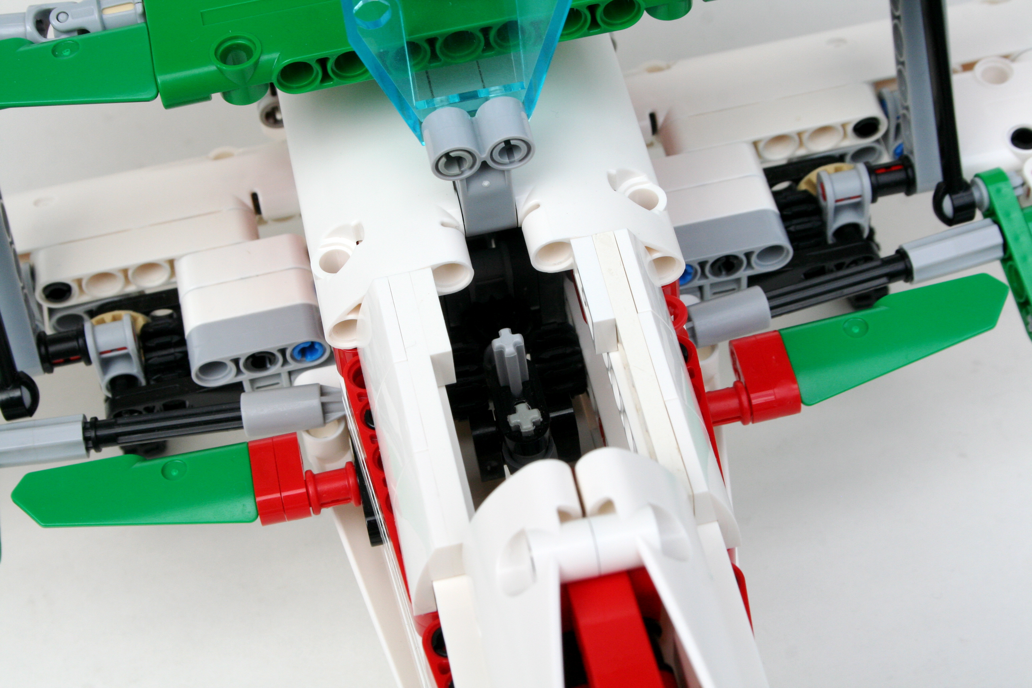 Just behind and above the worm gear is the joystick. The roll functions are connected to the bottom wing by gears, and the pitch function is connected by liftarms to the rear elevator. The rudder is fixed. The lower ailerons are connected to the upper ailerons by a simple 9L link. When you move the joystick, all four ailerons move. The cockpit is a little cramped, but when you are racing space is not a concern, only speed.