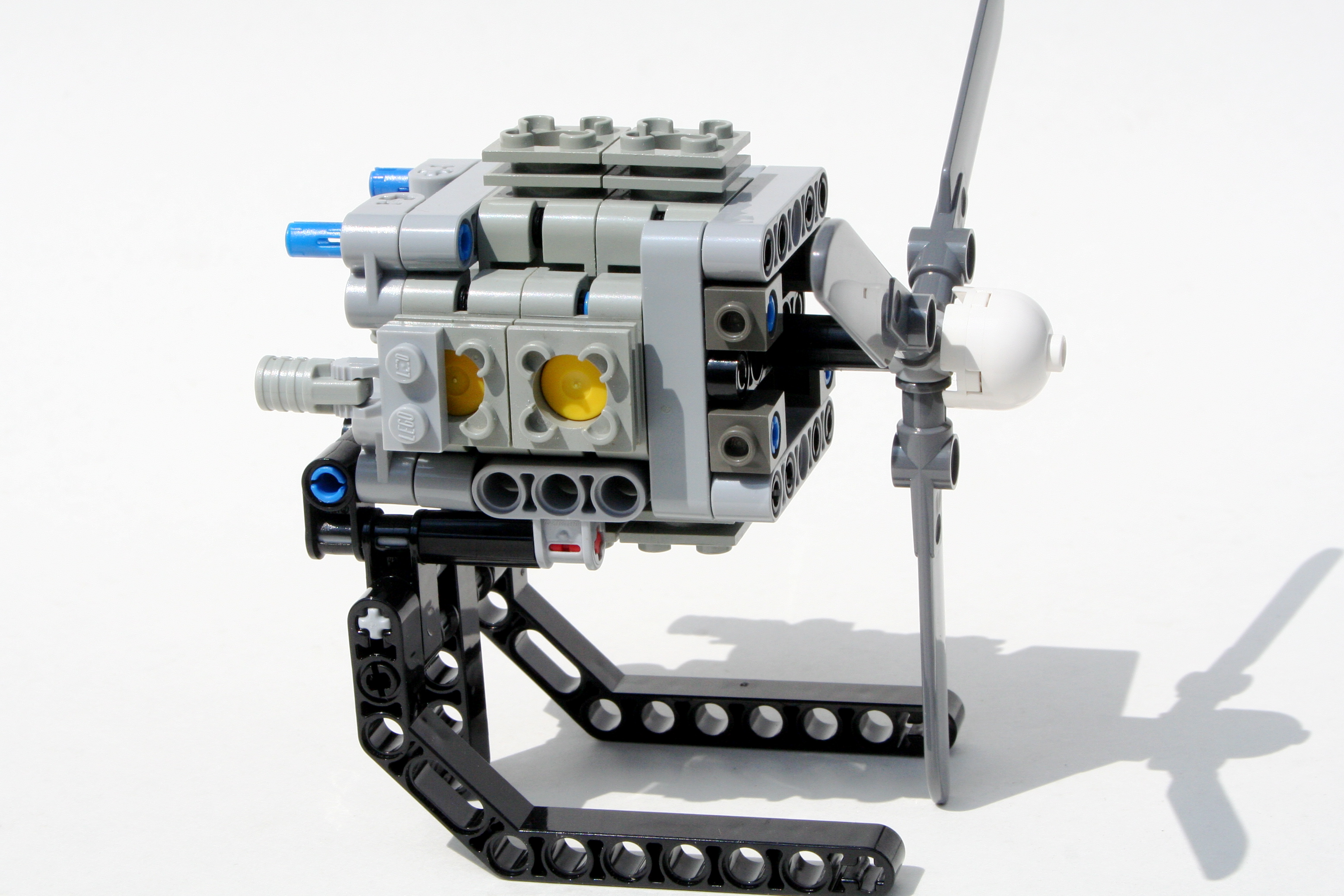 I started with the radial. It’s not quite a radial, but rather two perpendicular boxer 4 cylinder engines. Each bank of two cylinders are mounted in a different direction; up, down, port, and starboard, and are connect by one common crankshaft. The side banks are one stud forward, and the up and down banks rear, so all eight connecting rods can fit on a common 5l axle. Two engine crankshafts are mounted at each end. The motor spins well, and quite quickly, but the connection is not exactly “legal,” as the pins on the cylinders are a little stressed.