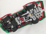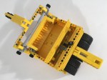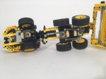 I decided early that I want to keep the motors out of the boom. So I had to route the lifting function out to the forklift body through the bottom pivot. This required routing the lifting axle under the drive differential. The lifting axle then move rearward, and connected up to a PF L motor. On top of the lifting axle was the drive axle. The PF XL motors was mounted transversally on the right side, and drove and axle forward to connect directly to the differential. To give me some additional space at the front, a portal axle was mounted on its side to move the differential rearward. A PF Servo was mounted in the rear, over the steering axle, and drove the steering function. The steering uses some 2×4 liftarms mounted at an angle to allow for a better steering angle. Finally, a PF M was mounted in front of the Servo, under the cabin to drive the tilt function. None of the mechanics were difficult, but the packaging required a number of drafts.