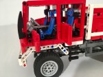 Which brings us to the cab. I wanted to use the face of Horcik’s truck, but wanted to add some changes. I added two doors to make the cab a little longer, and added four of the new panel parts that work great as seats. Then I made sure the cab could be tilted simply, and connected the two roof lights to the steering. You can see the engine and the steering when the cab is tilted.