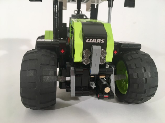 The Atos started a couple of years ago when I completed the 9393 update. I wanted a front PTO in a small tractor. Lime parts were becoming more prevalent (though we are still missing a red medium wheel), so I figured I could make something work. I started with the front axle, as it would need steering, a PTO shaft, and something to lift an implement. The PTO shaft runs directly forward from the rear differential under the steering rack. Another axle runs a stud and a half to the left, which drives a worm gear to elevate the front drawbar.