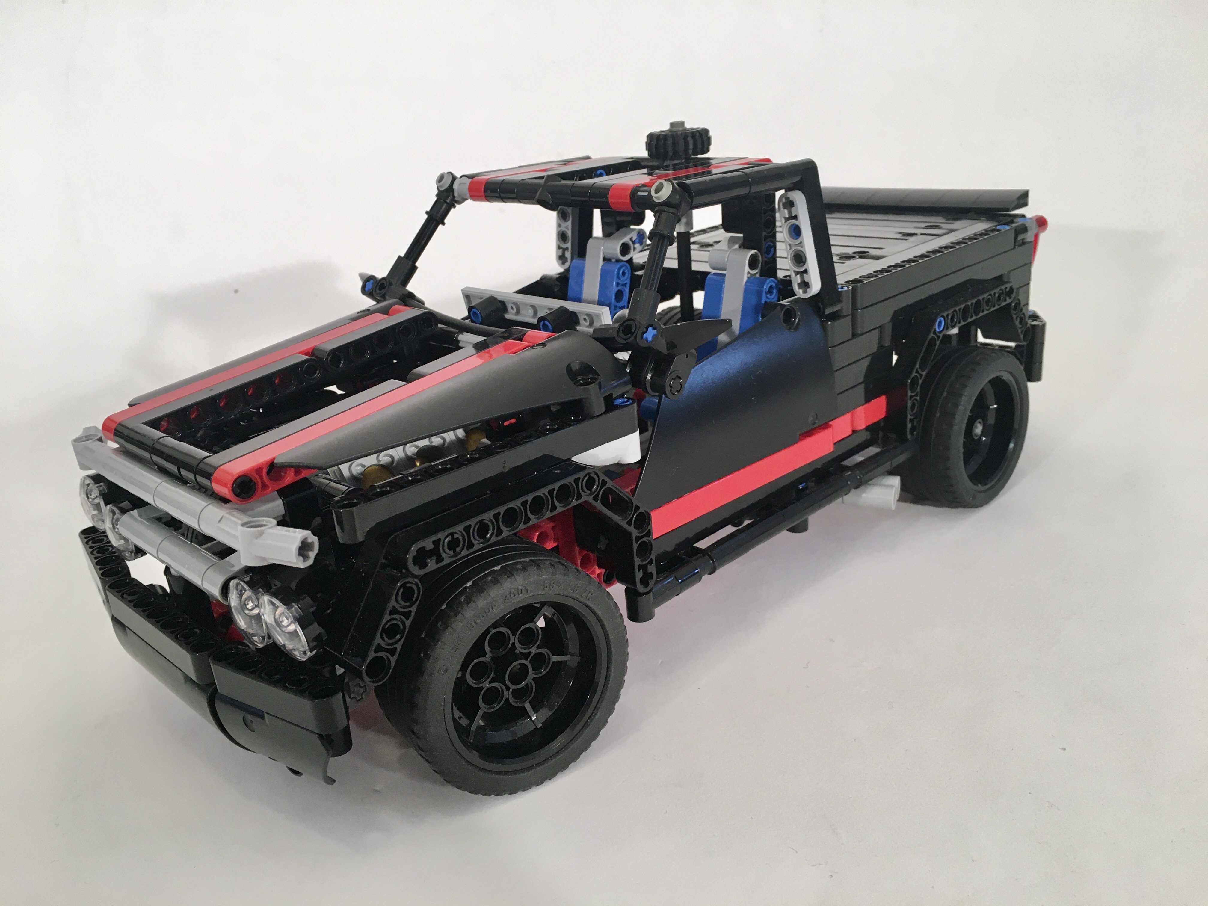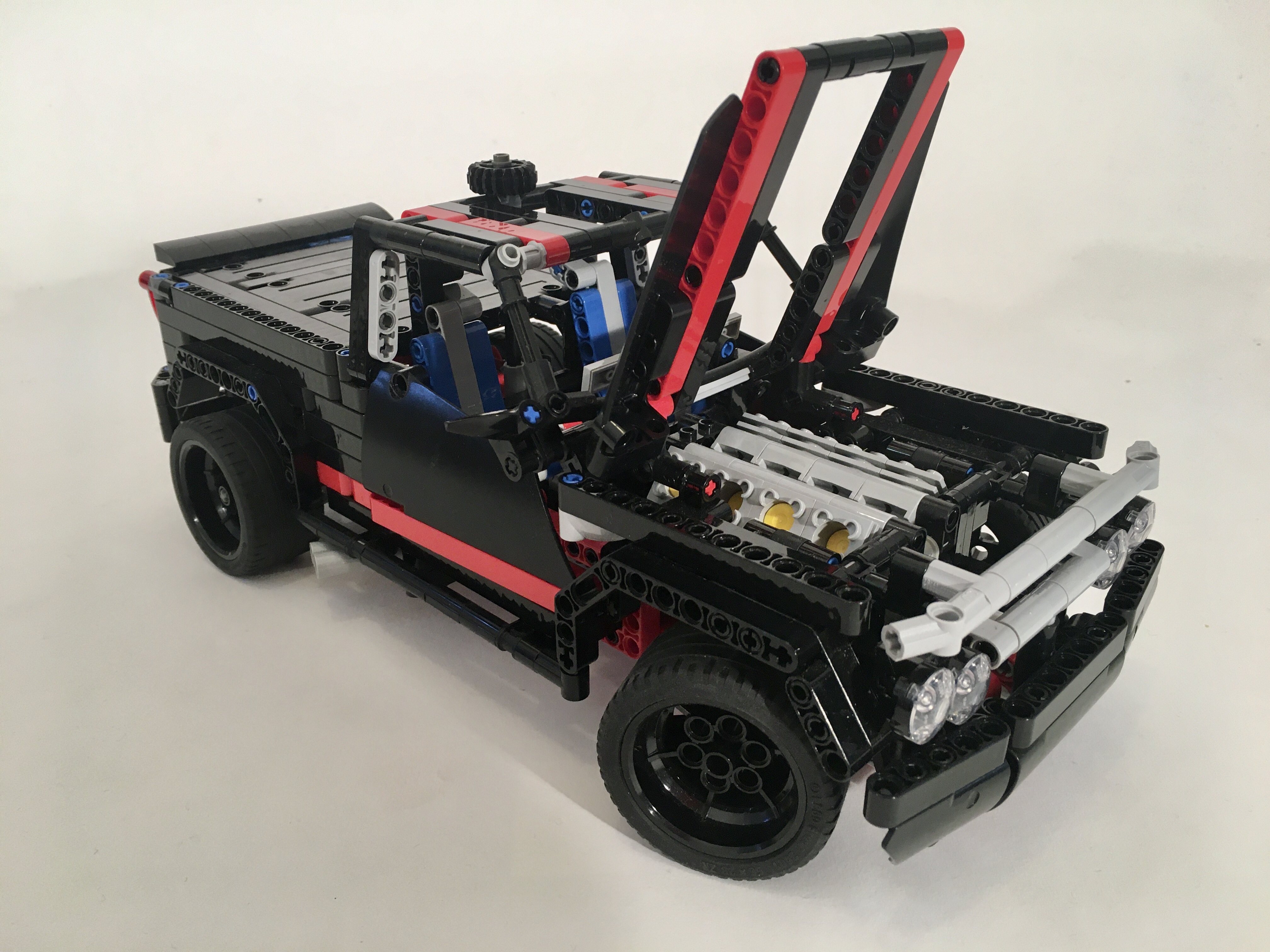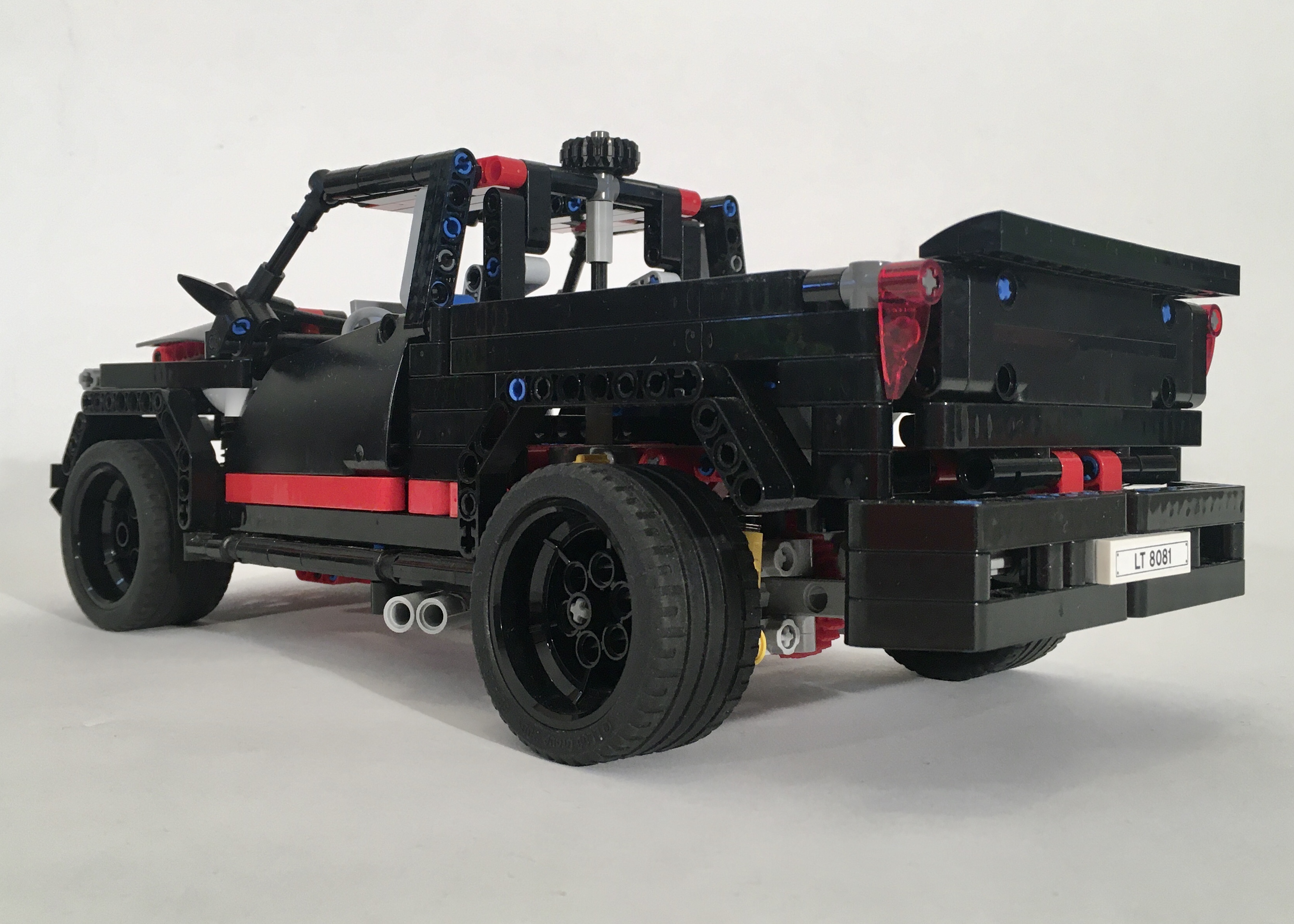 It’s becoming a bit of a bad habit for me to start a new project while I am currently building something else. While I was building the 8081 110, I founds myself making another draft of a little pickup. I moved pretty quickly on the 8081 110, but this project stalled. The chassis came together quickly. The live axle rear suspension is a simple design with five links to keep non-vertical movement at bay. The front is a simple independent wishbone design just like the original 8081. Finally, I placed a V-8 right over the front suspension, and geared it to the rear wheels. I used the new differential in the rear axle, which drives the V-8 a little faster than in my previous designs.