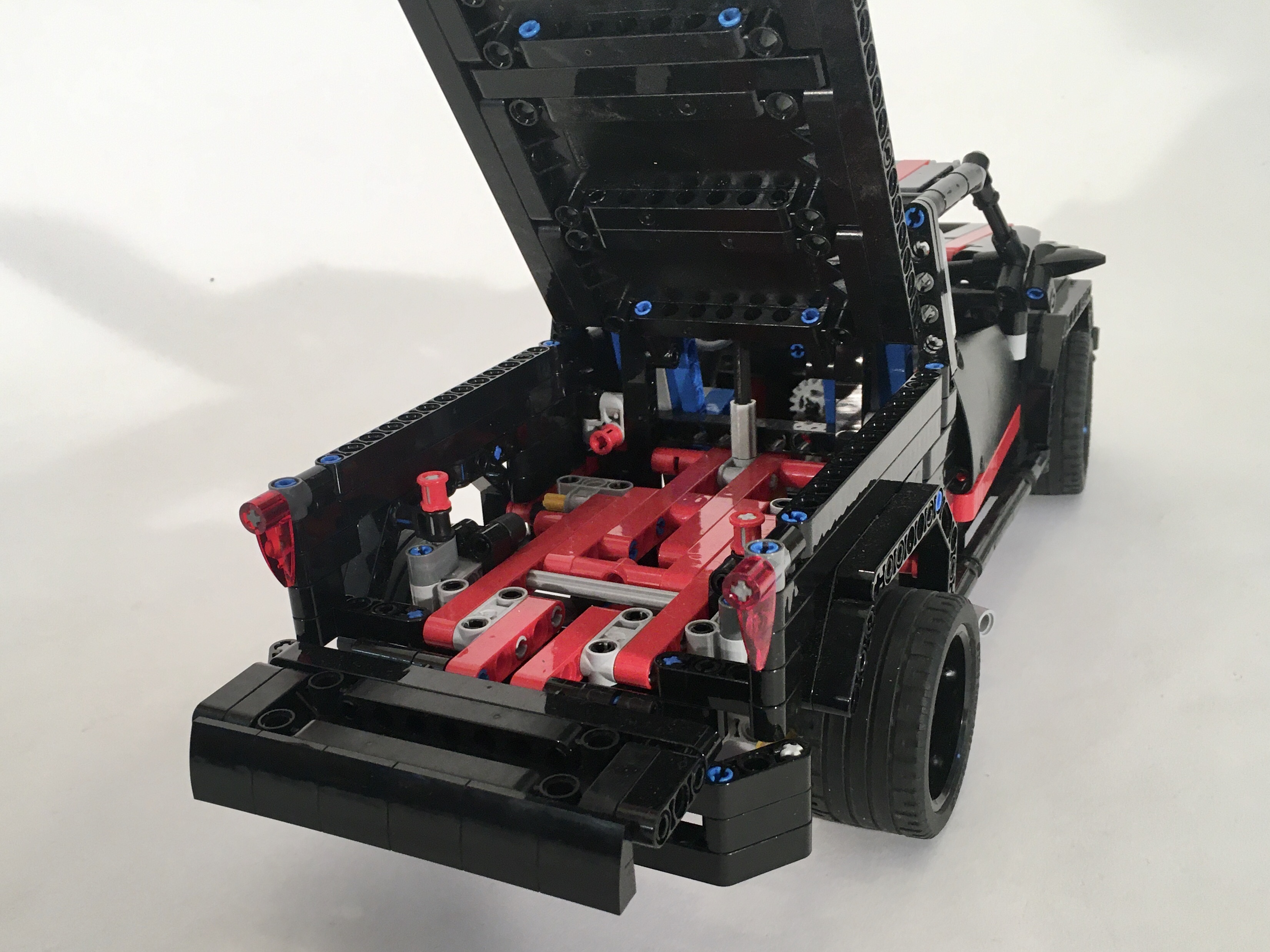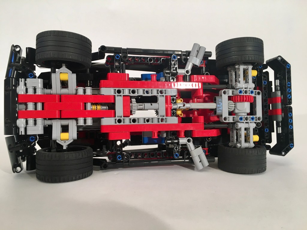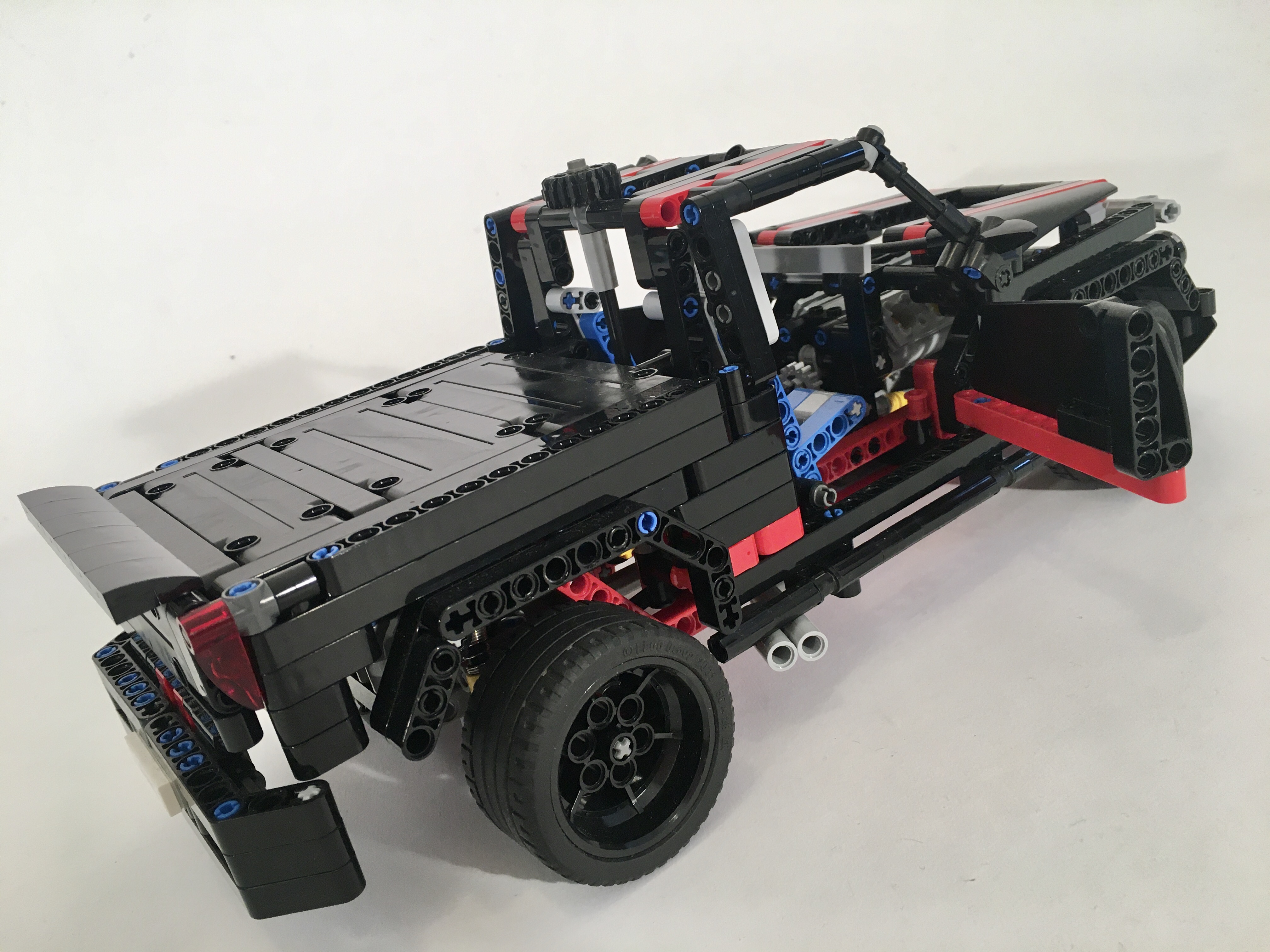 It’s becoming a bit of a bad habit for me to start a new project while I am currently building something else. While I was building the 8081 110, I founds myself making another draft of a little pickup. I moved pretty quickly on the 8081 110, but this project stalled. The chassis came together quickly. The live axle rear suspension is a simple design with five links to keep non-vertical movement at bay. The front is a simple independent wishbone design just like the original 8081. Finally, I placed a V-8 right over the front suspension, and geared it to the rear wheels. I used the new differential in the rear axle, which drives the V-8 a little faster than in my previous designs.