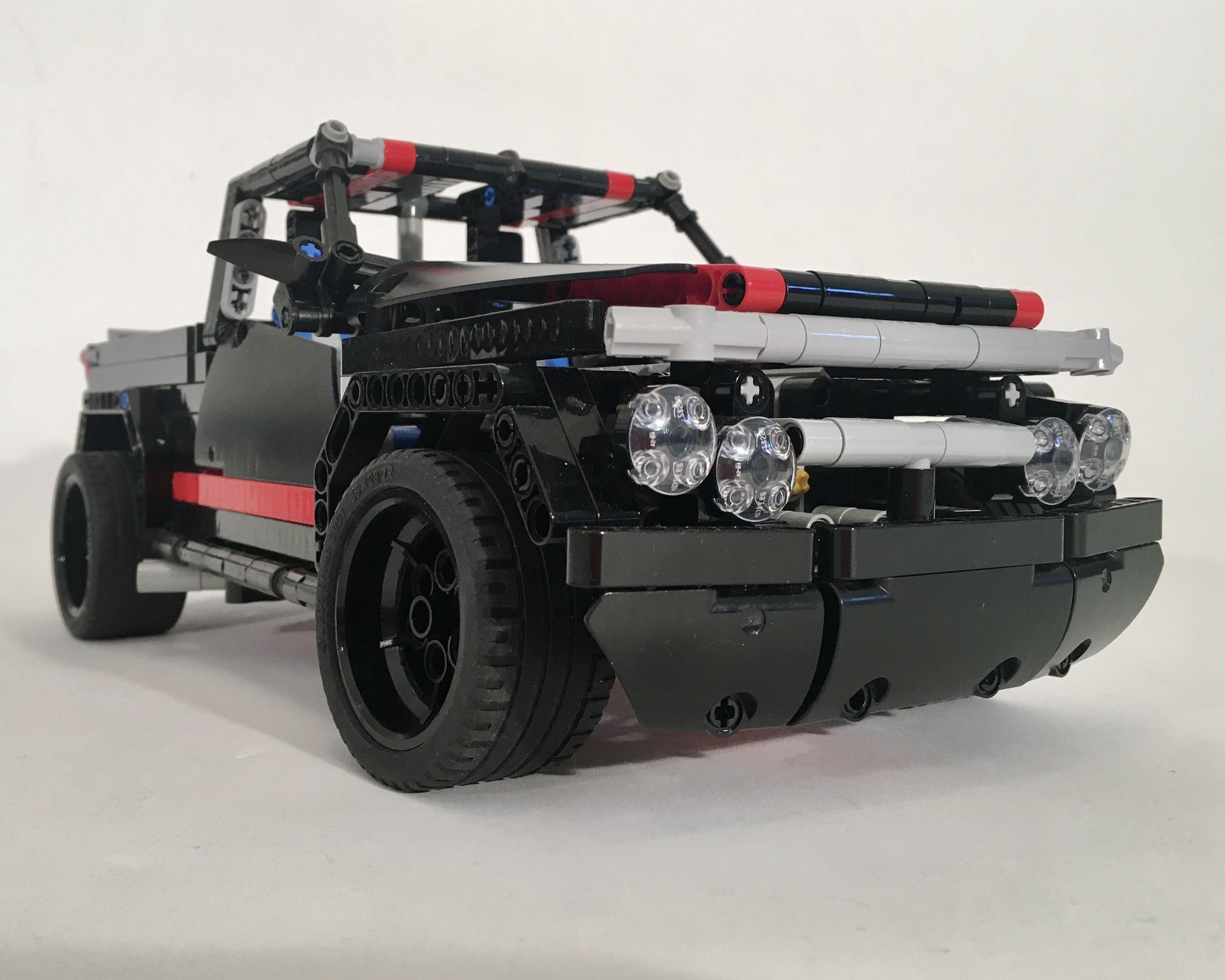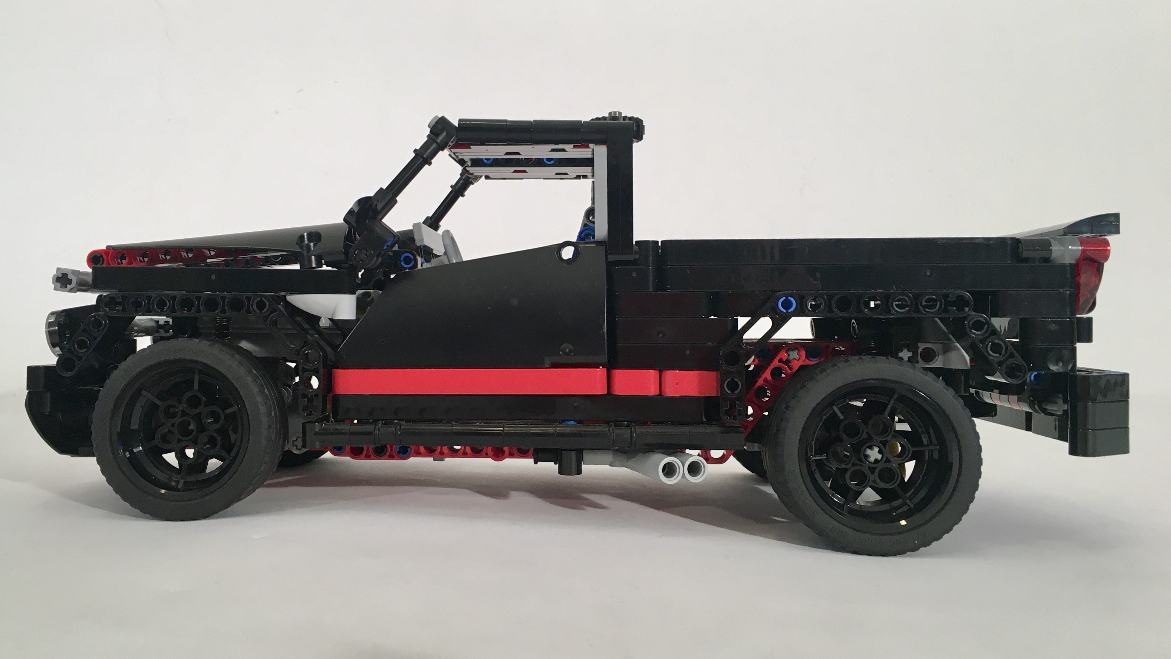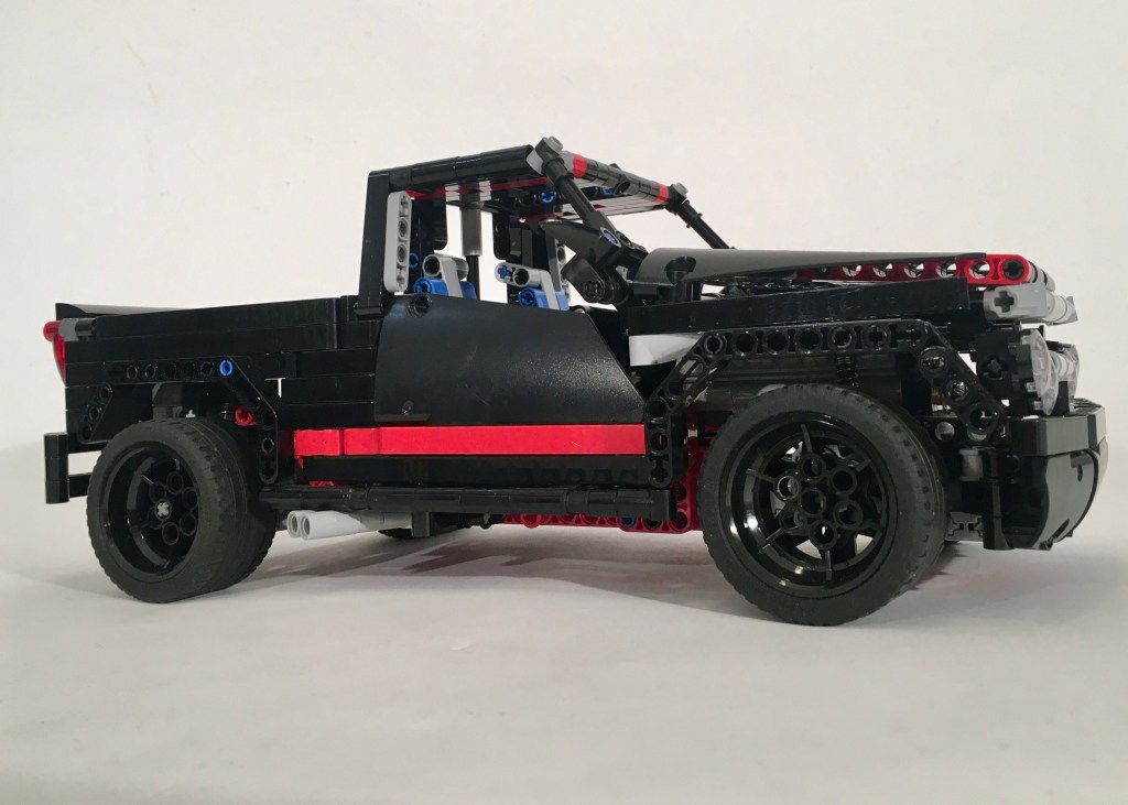 The sport pickup is a silly I idea that was all the rage in the United States in the late ’90s and early ’00s. Pickups like the SVT Lightning, the Ram STR-10, and my personal favorite the Dodge Dakota RT, were prevalent. This MOC slowed while I was trying to get the styling in the vein of these notable pickups. I liked what I designed for the front and rear bumper, and the rear bed was sufficient. But all the designs I came up with for the hood and the front grill looked dull and basic. Each of the above pickups had bold grills, and a hood line that communicated more power than anyone would need.