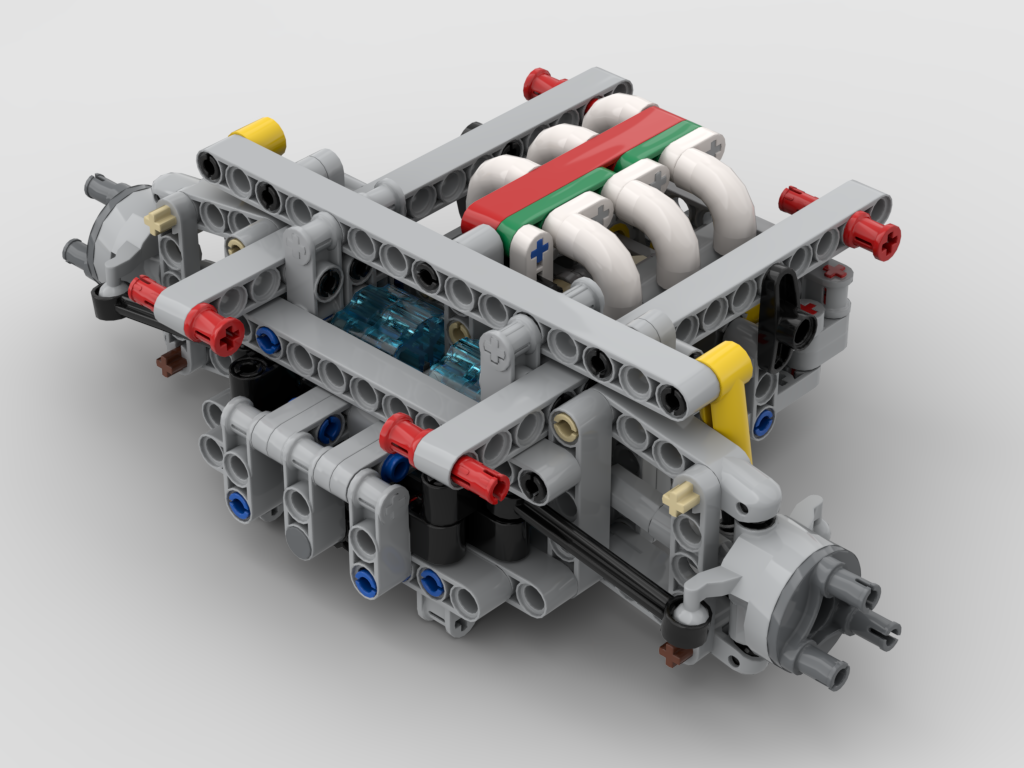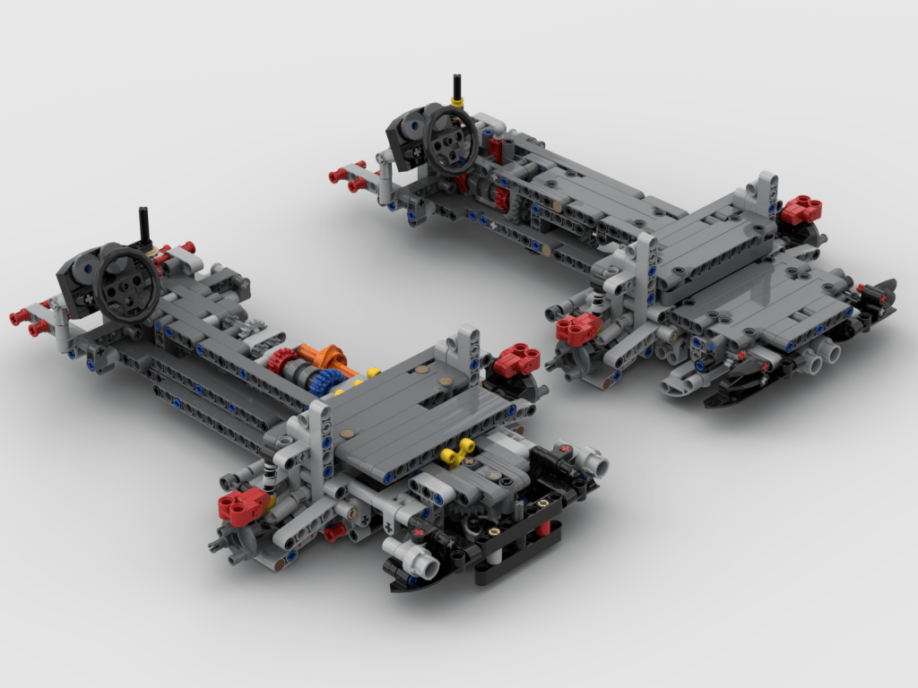 The engine tubs were a lot of fun and took less time than I thought they would. There are two tubs. The first, is built to support the front independent suspension and two different engine designs. The Straight Six is my favorite engine, so I wanted to make this options possible. The steering race for this module is placed far forward to allow for the I-6 to fit. In fact, the front of the engine is two studs from the front of the car. The V-8 fits well, and is placed behind the front axle centerline. The second engine tub features a fixed Flat 6 engine, and two fake electric motors; one for each side of the front axle. This unit is the hybrid and All Wheel Drive engine tub. Each tub attaches to either transmission module with six pins and one axle for steering. Drive connects by a 8 tooth gear off the engine.