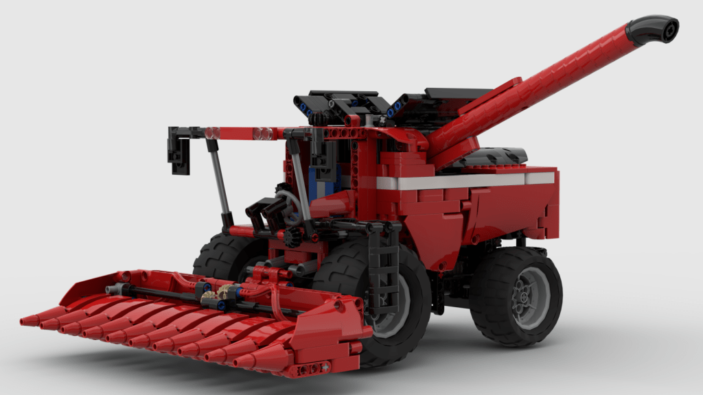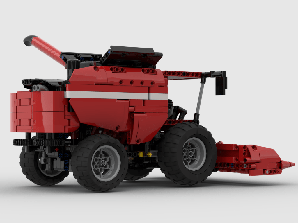 I was putting off building a combine for a while because they are pretty complicated. It took me a while before I felt like I understood enough about them to translate them to a LEGO MOC. After some time learning about them, I was ready to begin something. The scale was set based on the Atmos Tractor, so then it was a matter of deciding how many features I could add into the model. The models started with the thrashing mechnism, and then everthing fit in around it. I settled on a rotating thresher rather than a set of shuffling screens. In the center of the combine is a rotating auger that separates the grain from the staukes. As the auger spins it move the crop rearward separating the grain as it travels rearward. In the MOC, the auger is connected to the front wheels as the combine moves. Under the auger is a reciprocating screen that further separates the grain. Likewise this is also connected to the front wheels. At the rear of the auger are two spreaders that spread the chaft out the back of the combine.