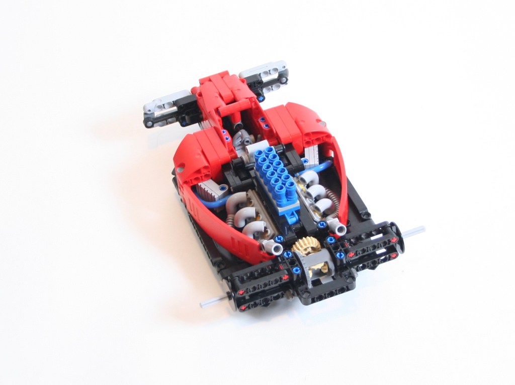 I kept the V6 that 8440 had, and devised a new rear transmission to the rear wheels. It is single speed, but it is geared up in a way that the engine spins faster than it does in the original. I then started adding details to the engine that would fit under the engine cover. I had to keep some exhaust pipes, and cooling radiators, but it took a little time to get those to look the way I wanted. I finally found a solution that was a step up from the old pneumatic tubes.