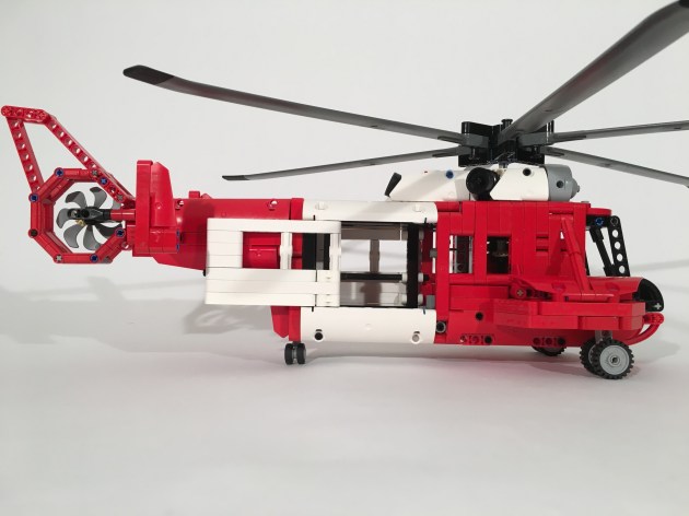 The body work came together quickly with the exception of the rear doors. I wanted to add two sliding doors with windows, and based on the color scheme of the helicopter, they had a to be white. After six drafts, I finally came up with a solution that was doable. They are not perfect, but all the other designs had windows that were comically small, or too low in on the body. Unfortunate, the design calls for six white rare parts. The rest of the bodywork turned out well. The nose, while a little clunky, looked how I wanted. The top area looked good with the three engine exhausts, and the six bladed rotor, while overdone, fit perfectly. Oh, and with clever pin placement, you can fold the rotor back towards the tail. The tail looked sharp with the ducted fan. The vertical stabilizer looked empty, but that’s a problem for all LEGO Technic aircraft with the exception of 42040 (maybe).