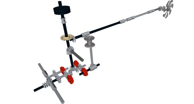 The final control adjusts the yaw of the aircraft. The MD600N uses three methods to give anti-torque to the main rotor. In forward flight the 1) tail planes give directional stability. The tailboom also has 2) two slits that provide a “Coanda Effect” from the main rotor downwash. Finally, at the end of the boom is a 3) movable jet direct thruster (all are nicely discussed here). This thruster rotates to force more or less thrust against the torque of the main rotor, much like the more common tail rotor. In this MOC, the thurster rotates on a small turntable, and has an axle running through the boom the controls the rotation. The axle connects to the floor petals by way of a flex cable, and a liftarm running below the cockpit. Both pedals are linked together.